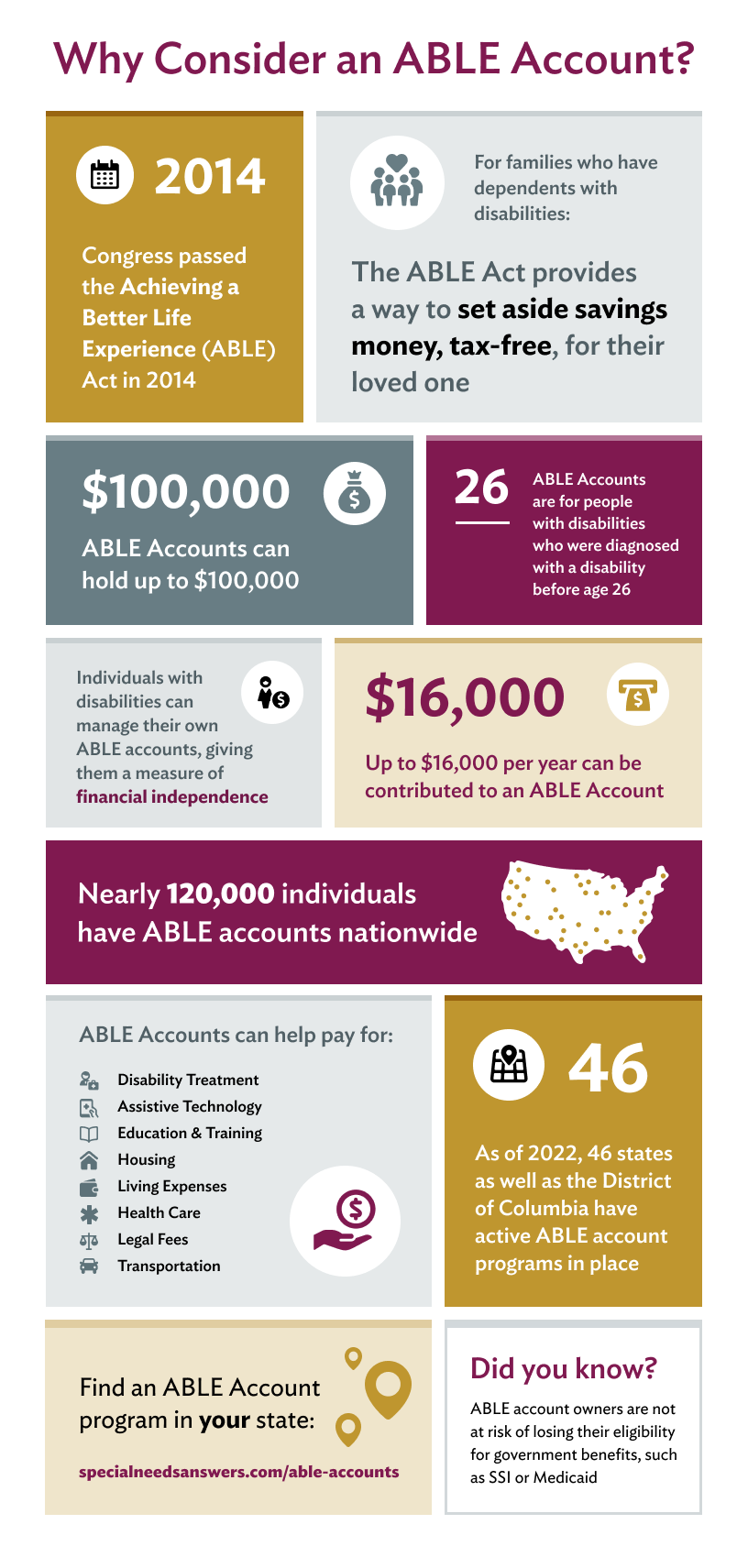 For more on ABLE accounts, including fact sheets, articles and short webinars, visit the ABLE National Resource Center.